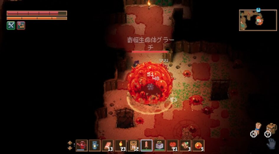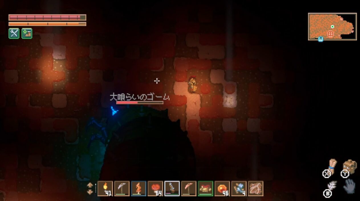 コアキーパー基本的な動作は莫大な量の壁を掘ってボスのところまで行き、次のエリアへのアイテムをゲット。という流れです。